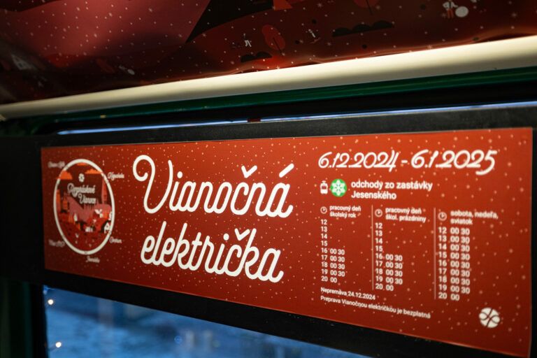 Rozpis odchodov vianočnej električky, ktorá premáva v uliciach hlavného mesta. Bratislava, 7. december 2024. Foto: SITA/Jana Birošová
