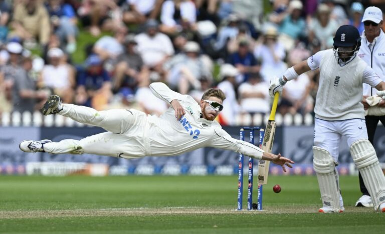 Glenn Phillips z Nového Zélandu je vo vzduchu, keď sa pokúša odohrať loptičku počas druhého dňa druhého kriketového testu medzi Novým Zélandom a Anglickom v Basin Reserve vo Wellingtone na Novom Zélande v sobotu 7. decembra 2024. Foto: Andrew Cornaga/Photosport via AP