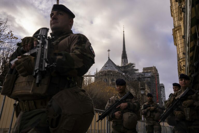 Vojaci hliadkujú pri ikonickej francúzskej katedrále Notre Dame v sobotu 7. decembra 2024 v Paríži pred jej oficiálnym znovuotvorením po prvý raz od ničivého požiaru. Foto: SITA/AP
