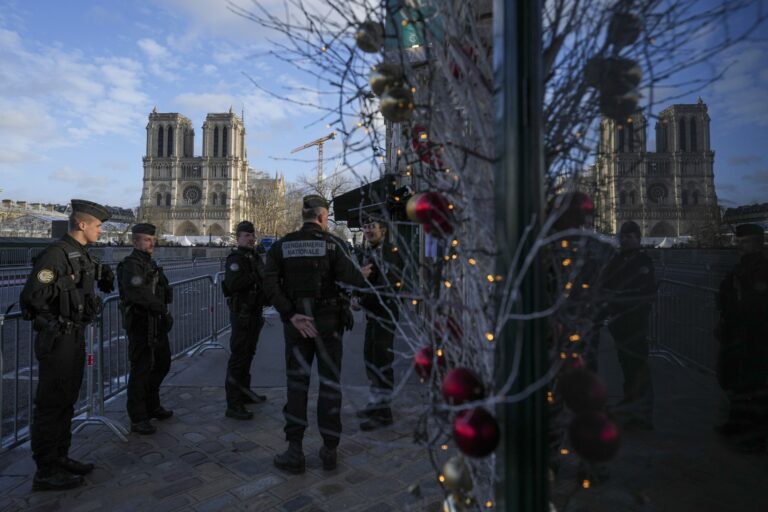 Policajti stoja na stráži pri ikonickej francúzskej katedrále Notre Dame v sobotu 7. decembra 2024 v Paríži pred jej oficiálnym znovuotvorením po prvý raz od ničivého požiaru. Foto: SITA/AP