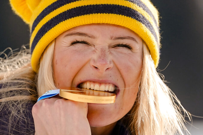 Švédka Frida Karlsson pózuje s olympijským zlatom po pretekoch žien v klasicko-voľnom skiatlone na 10 km + 10 km počas zimných olympijských hier 2026 v talianskom Tesere. Taliansko, 7. februára 2026. Foto: AP Photo/Matthias Schrader