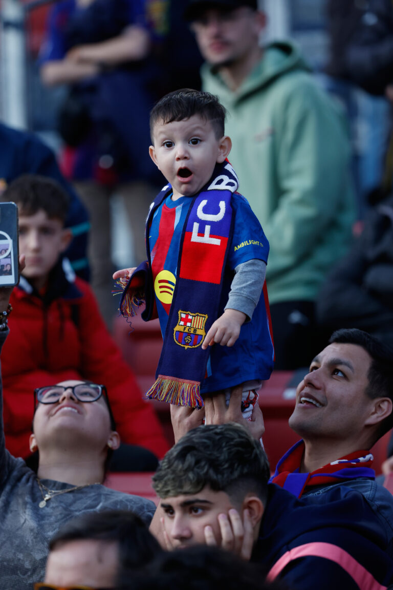 Fanúšik Barcelony zdvihol dieťa počas prestávky v zápase španielskej La Ligy medzi Barcelonou a Mallorcou v Barcelone. Španielsko, 7. februára 2026. Foto: AP Photo/Joan Monfort
