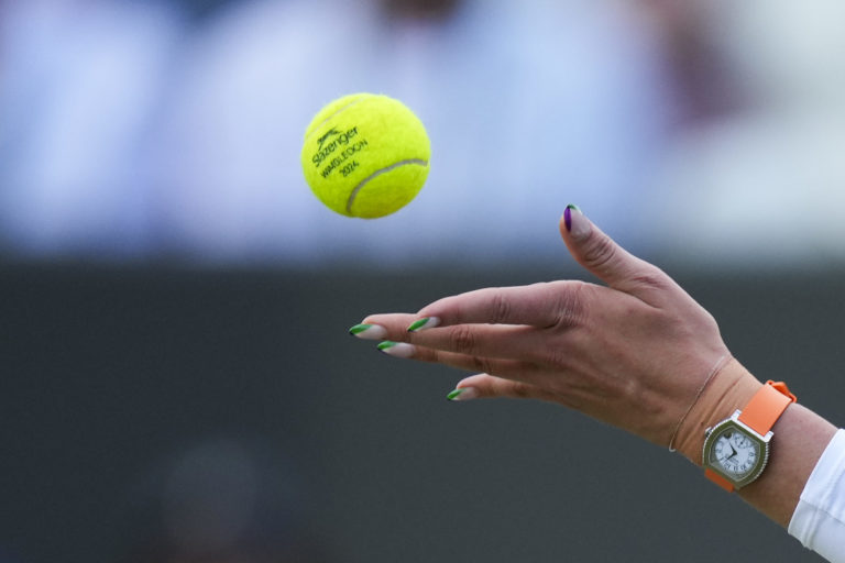 Chorvátska tenistka Donna Vekičová podáva Španielke Paule Badosovej počas zápasu štvrtého kola na tenisovom turnaji vo Wimbledone v Londýne v nedeľu 7. júla 2024. Foto: SITA/AP