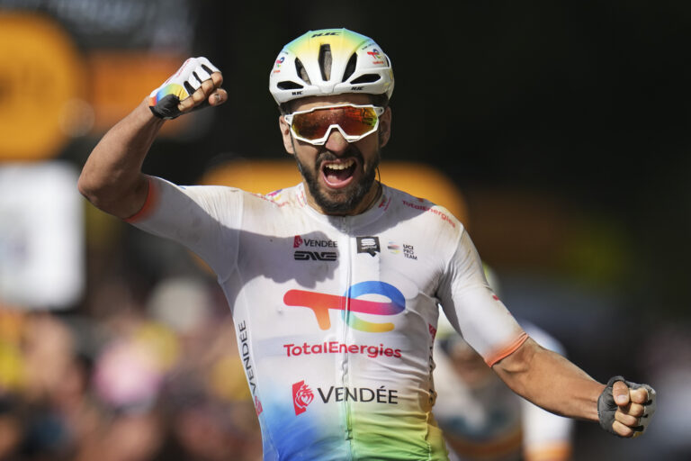 Francúz Anthony Turgis oslavuje víťazstvo v deviatej etape cyklistických pretekov Tour de France na 199 km so štartom a cieľom v Troyes vo Francúzsku v nedeľu 7. júla 2024. Foto: SITA/AP