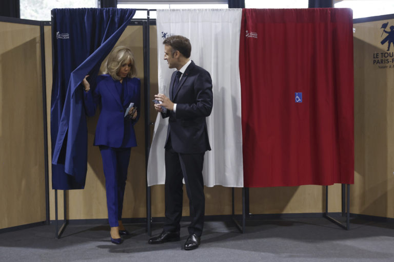 Francúzsky prezident Emmanuel Macron a jeho manželka Brigitte Macronová odchádzajú z volebnej miestnosti pred hlasovaním v druhom kole parlamentných volieb v Le Touquet-Paris-Plage na severe Francúzska v nedeľu 7. júla 2024. Foto: Mohammed Badra, Pool via AP