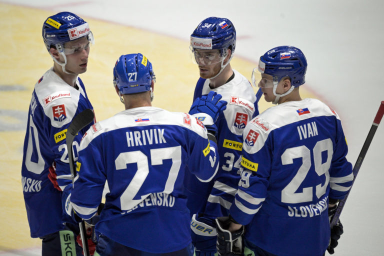 Zľava: Juraj Slafkovský, Marek Hrivík, Peterr Cehlárik a Michal Ivan (Slovensko) počas prípravného medzištátneho zápasu výberov mužov Slovenska a USA. Bratislava, 7. máj 2024. Foto: SITA/Milan Illík