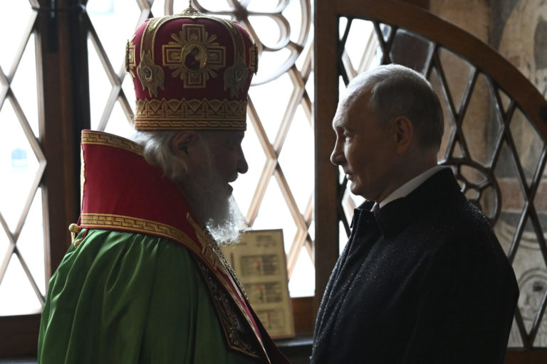 Russian President Vladimir Putin, right, and Patriarch Kirill of Moscow and all Russia talk during a prayer service following an inauguration ceremony at the Kremlin's Annunciation Cathedral in Moscow, Russia, Tuesday, May 7, 2024. (Alexey Maishev, Sputnik, Kremlin Pool Photo via AP)