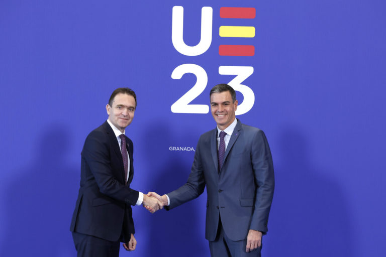 Zľava: Predseda vlády SR Ľudovít Ódor a predseda vlády Španielska Pedro Sánchez počas neformálneho samitu Európske únie v španielskej Granade. Foto: SITA/Úrad vlády SR.