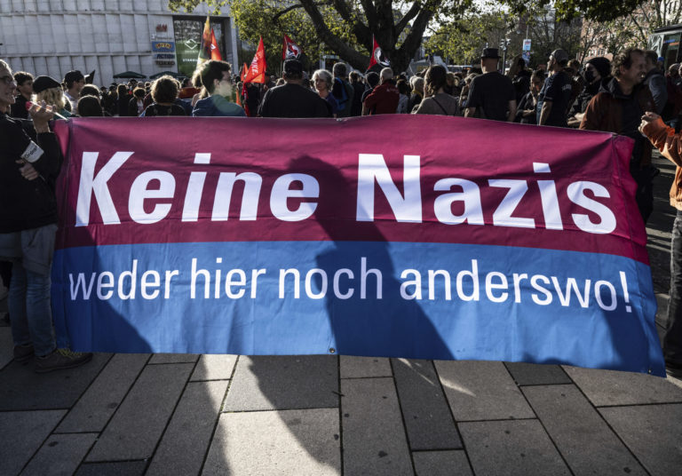 Stovky ľudí vo meste Weisbaden demonštrujú proti pravicovej strane AfD Foto: Boris Roessler/dpa via AP.
