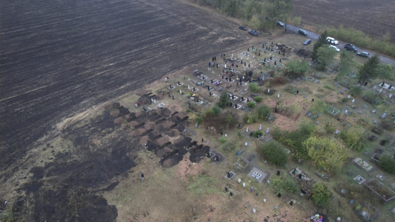 Nové hroby na cintoríne v dedine Hroza blízko Charkova pre obete raketového útoku, pri ktorom zahynulo viac ako 50 ľudí. Foto: SITA/AP.