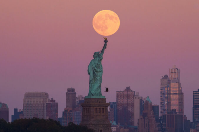 Supermesiac, známy ako Harvest Moon vychádza za Sochou slobody a panorámou Brooklynu. New Jersey, 6. októbra 2025. Foto: (AP Photo/Adam Gray)