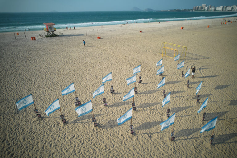Izraelské vlajky a fotografie izraelských rukojemníkov držaných Hamasom v pásme Gazy, vystavené na pláži Copacabana v Rio de Janeiro, ktorú umiestnila mimovládna organizácia Rio de Paz pri príležitosti dvoch rokov od smrteľného útoku Hamasu na Izrael. Brazília, 7. októbra 2025. Foto: (AP Photo/Silvia Izquierdo)