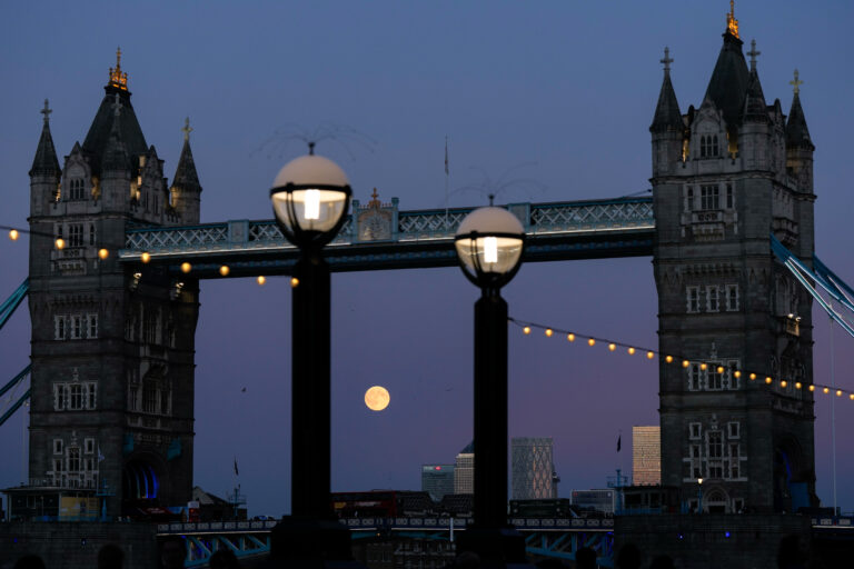 Supermesiac, známy ako Harvest Moon vychádza za Tower Bridge v Londýne, Anglicko, 6. októbra 2025. Foto: (AP Photo/Julia Demaree Nikhinson)