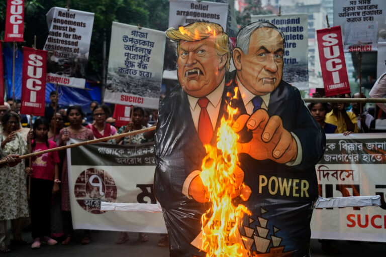 Demonštranti z Centra socialistickej jednoty Indie a komunizmu (SUCI-C) kričia slogany a pália podobizeň prezidenta Donalda Trumpa a premiéra Benjamina Netanjahua neďaleko amerického konzulátu počas protestu na znak solidarity s Globálnou flotilou Sumud po tom, čo izraelské námorníctvo zadržalo lode v Kalkate. India, 7. októbra 2025. Foto: (AP Photo/Bikas Das)