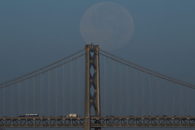 Supermesiac známy ako Harvest Moon zostupuje za most Bay Bridge z Alamedy. Kalifornia, 7. októbra 2025. Foto: (AP Photo/Godofredo A. Vásquez)