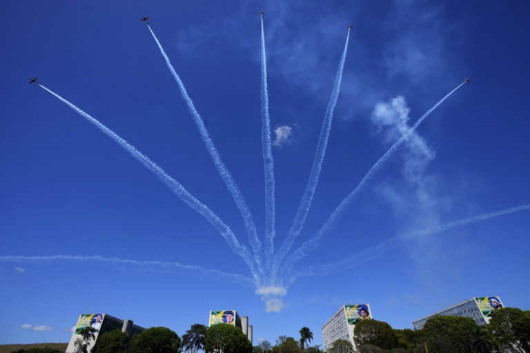 Formácia stíhačiek počas vojenskej prehliadky Dňa nezávislosti v Brazílii. Foto: SITA/AP.
