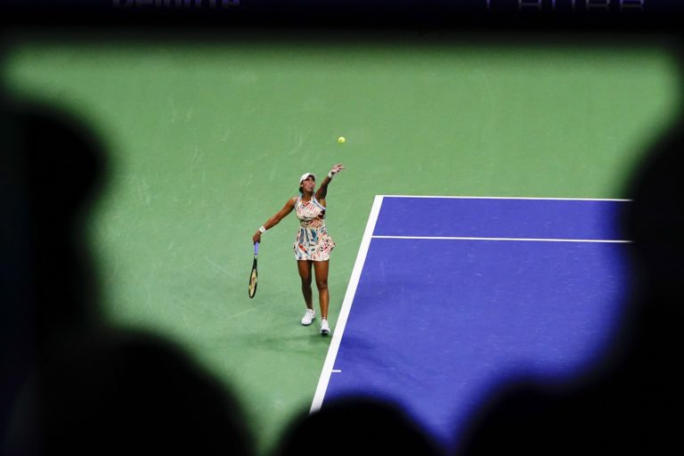 Americká tenistka Madison Keysová podáva proti českej tenistke Markéte Vondroušovej počas štvrťfinále US Open. Foto: SITA/AP.