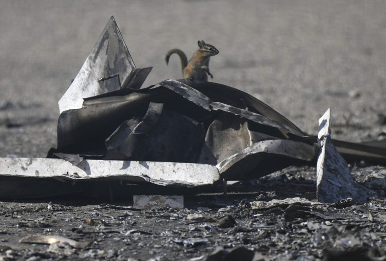 Veverička sedí na zhorených troskách čerpacej stanice, ktorú zničil lesný požiar v provincii Britská Kolumbia v Kanade. Foto: SITA/AP.