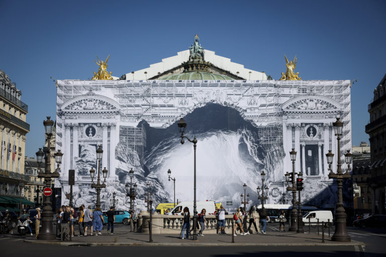 Ľudia kráčajú pred budovou parížskej opery, ktorá sa bude rekonštruovať do konca roka 2024. Francúzsky renomovaný streetartový fotograf JR vyzdobil fasádu Opery Garnier obrovským plátnom zobrazujúcim obrovskú jaskyňu. Foto: SITA/AP.