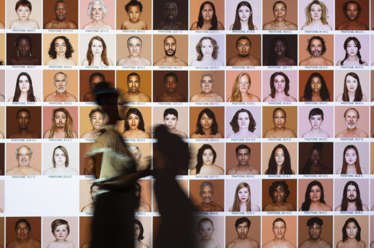 Silueta ženy pred umeleckým projektom 'Humana' umelkyne Angeliky Dass v rámci výstavy 'Nude' vo budove Fotografiska Berlin v Berlíne. Foto: SITA/AP.
