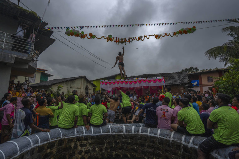 Skákajúci chlapec sa snaží rozbiť Dahi Handi, hlinený hrniec naplnený tvarohom, počas sviatku Janmaštami v indickej dedine Kurdus. Festival pripomína narodenie hinduistického boha Krišnu a tento akt sa snaží oživiť jeho príbeh, ktorý počas svojho detstva kradol maslo. Foto: SITA/AP.