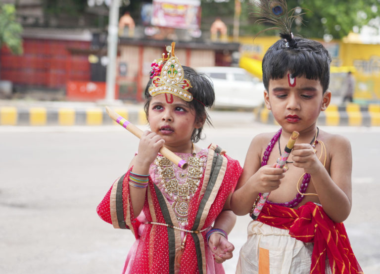 Deti sú oblečené ako hinduistickí bohovia Krišna a Rádhu pri príležitosti hinduistického festivalu Janmashtami v Prayagraj v Indii. Foto: SITA/AP.