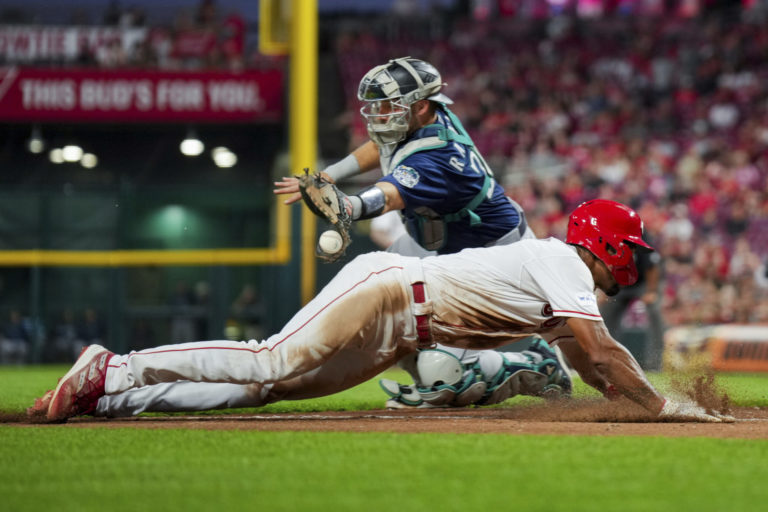 Baseballový hráč Cincinnati Reds' Will Benson (dole) skóroval, keďže hráčovi Seattle Mariners' Calovi Raleighovi sa nepodarilo chytiť včas loptu. Foto: SITA/AP.