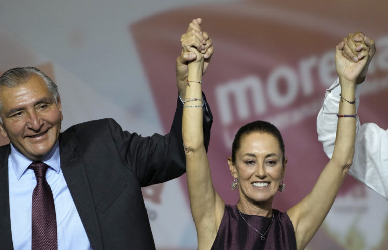 Mexický minister vnútra Adan Augusto Lopez (vľavo) a Claudia Sheinbaumová sa tešia po tom, čo Sheinbaumovú mexická vládna strana nominovala ako svoju kandidátku do budúcoročných prezidentských volieb. Foto: SITA/AP.