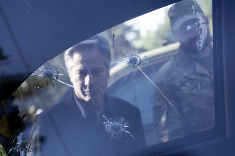 Americký minister zahraničných vecí Antony Blinken si prezerá poškodené vozidlo počas prehliadky pri mieste detašovaného úradu veliteľa bezpečnosti a zásobovania Ukrajinou. Foto: Brendan Smialowski, Pool Photo via AP.