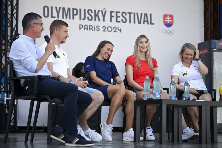 Zľava pozadí: Prezident Slovenského atletického zväzu Peter Korčok, šprintér Ján Volko, bežkyňa na 800 m Gabriela Gajanová, bežkyňa na 400 m Emma Zapletalová a trénerka atletiky Naďa Bendová počas privítania jedenástej ženy z olympijských pretekov na 800 m a novej slovenskej rekordérky Gabriely Gajanovej na Olympijskom festivale na Kuchajde po návrate z XXXIII. letných olympijských hier 2024 v Paríži. Bratislava, 8. august 2024. Foto: SITA/Milan Illík