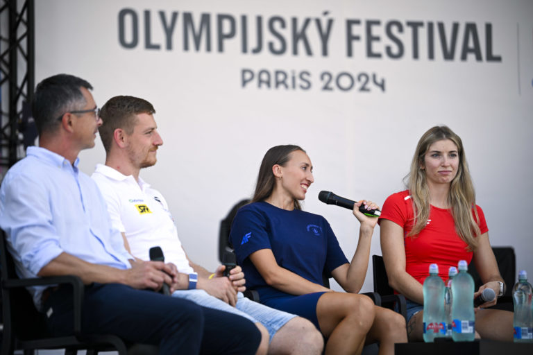 Zľava: Prezident Slovenského atletického zväzu Peter Korčok, šprintér Ján Volko, bežkyňa na 800 m Gabriela Gajanová a bežkyňa na 400 m Emma Zapletalová počas privítania Gabriely Gajanovej na Olympijskom festivale na Kuchajde po jej návrate z XXXIII. letných olympijských hier 2024 v Paríži. Bratislava, 8. august 2024. Foto: SITA/Milan Illík