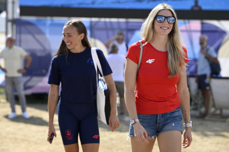 Zľava: Bežkyňa na 800 m Gabriela Gajanová a bežkyňa na 400 m Emma Zapletalová počas privítania Gabriely Gajanovej na Olympijskom festivale na Kuchajde po jej návrate z XXXIII. letných olympijských hier 2024 v Paríži. Bratislava, 8. august 2024. Foto: SITA/Milan Illík