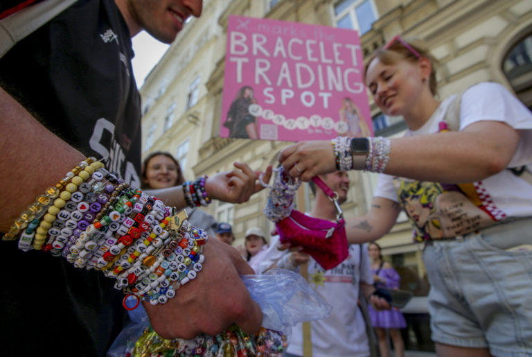 Fanúšikovia Taylor Swift si vymieňajú náramky v centre Viedne po zrušení koncertu. Štvrtok, 8. august, 2024. Foto: SITA/AP
