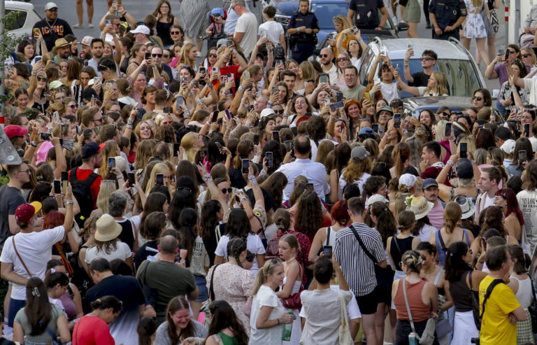 Fanúšikovia Taylor Swift sa zhromaždili v centre Viedne a vymieňajú si náramky i spievajú. Štvrtok, 8. august, 2024. Foto: SITA/AP