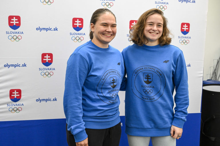 Zľava: Strelkyňa Vanesa Hocková a vodná slalomárka Zuzana Paňková počas mediálneho stretnutia v Šamoríne s vybranými športovcami, ktorí si vybojovali miestenky na Hry XXXIII. olympiády v Paríži a s kandidátmi na účasť na OH 2024. Šamorín, 8. december 2023. Foto: SITA/Milan Illík
