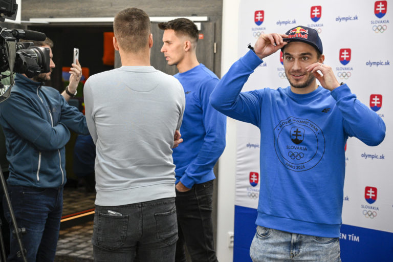 Vodný slalomár Jakub Grigar (vpravo) počas mediálneho stretnutia v Šamoríne s vybranými športovcami, ktorí si vybojovali miestenky na Hry XXXIII. olympiády v Paríži a s kandidátmi na účasť na OH 2024. Šamorín, 8. december 2023. Foto: SITA/Milan Illík