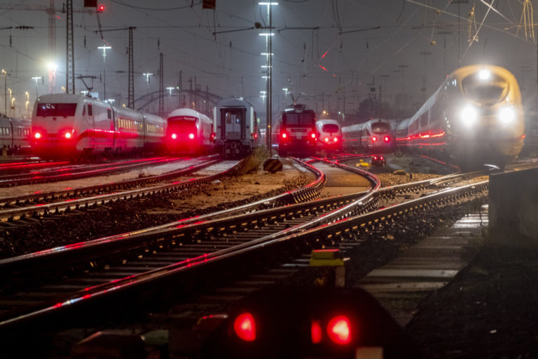 Členovia nemeckého odborového zväzu GDL, ktorý zastupuje rušňovodičov, počas piatkového štrajku. GDL sa snaží o zvýšenie miezd, jednorazovú platbu, ktorá by mala vykompenzovať vplyv inflácie, aj o zníženie týždenného pracovného času z 38 na 35 hodín. Foto: SITA/AP.