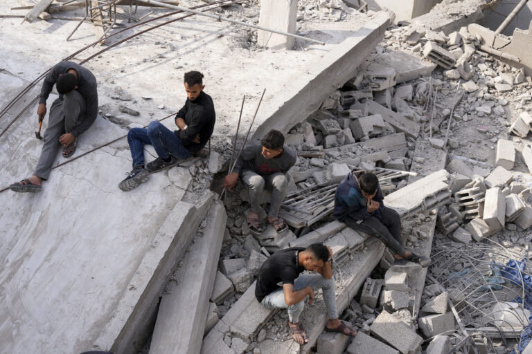 Palestínčania sedia pri budove rodiny Al-Nadi, ktorú zničil izraelský nálet na Pásmo Gazy. Foto: SITA/AP.
