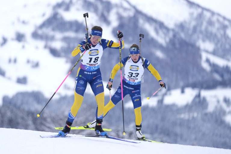 Švédska biatlonistka Elvira Öbergová (vpredu) a jej krajanka Linn Perssonová súťažia počas pretekov Svetového pohára v biatlone na 7,5 km v šprinte v rakúskom Hochfilzene. Foto: SITA/AP.