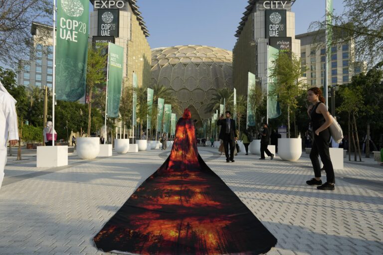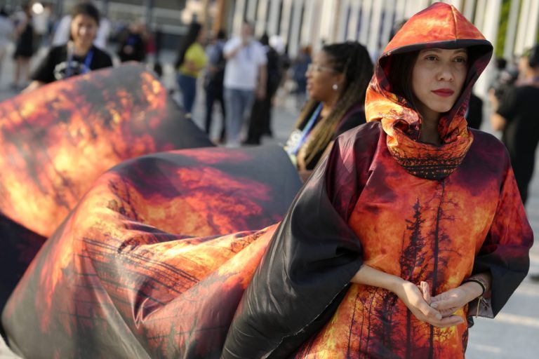 Islene Facanha z Portugalska počas demonštrácie s obrázkami lesných požiarov, ktorá sa koná v Dubaji popri klimatickom samite OSN COP 28. Foto: SITA/AP.