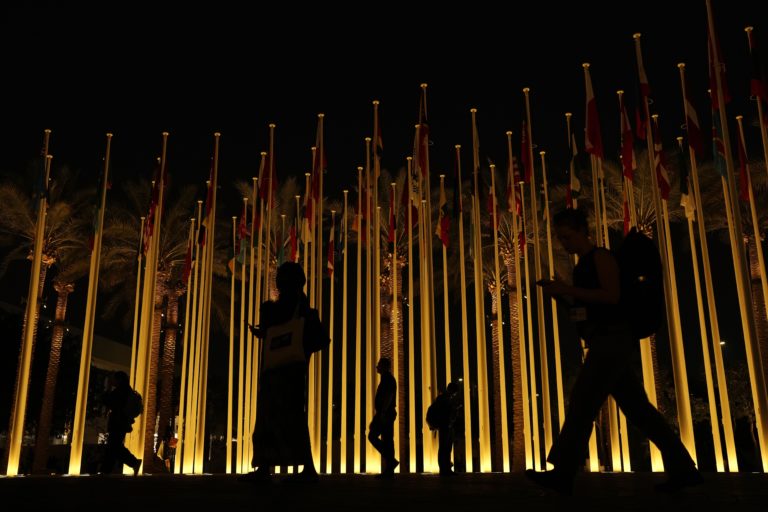 Ľudia prechádzajú okolo vlajok krajín, ktoré sa zúčastňujú klimatického samitu OSN COP28 v Dubaji. Foto: SITA/AP.