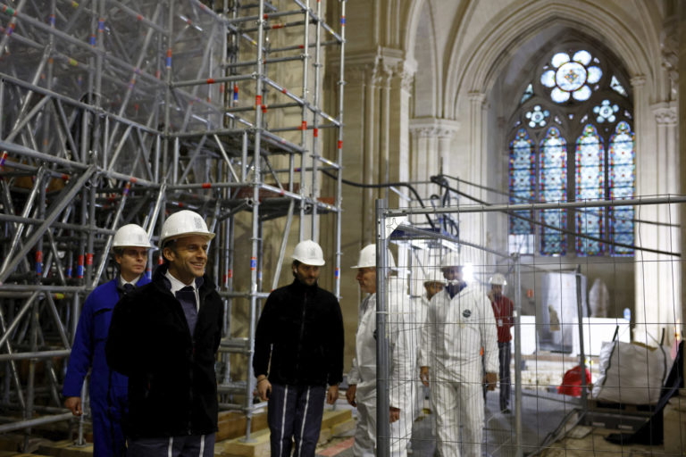 Francúzsky prezident Emmanuel Macron (druhý zľava) navštívil katedrálu Notre Dame v Paríži. Foto: Sarah Meyssonnier, Pool via AP.