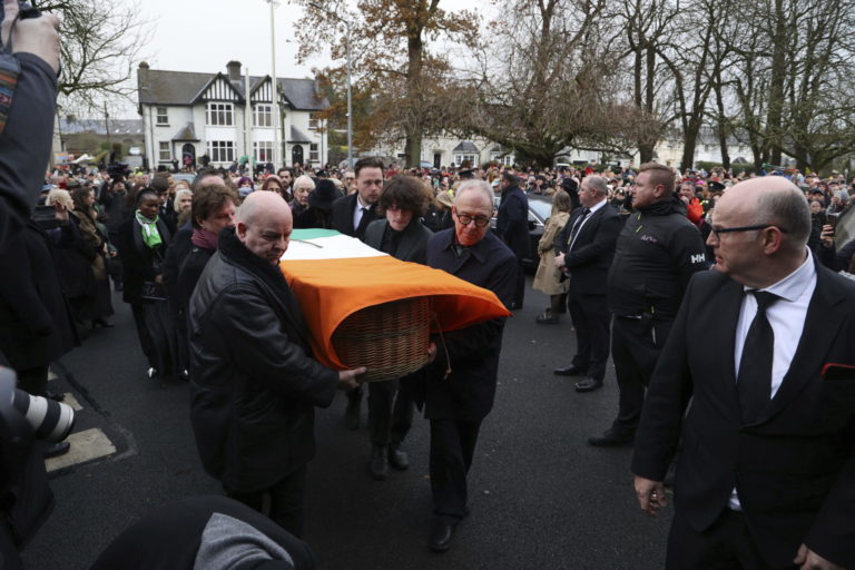 Smútočný sprievod nesie do kostola rakvu s írskym spevákom a skladateľom Shanom MacGowanom, ktorý sa dožil 65 rokov. Foto: Damien Eagers/PA via AP.