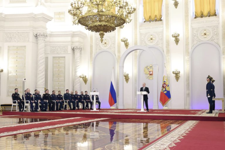 Ruský prezident Vladimir Putin má prejav počas ceremoniálu odovzdávania medailí Zlatej hviezdy Hrdinom Ruska v predvečer Dňa hrdinov vlasti v Moskve. Foto: Valery Sharifulin, Sputnik, Kremlin Pool Photo via AP.
