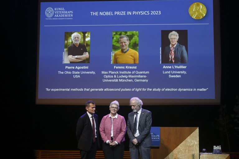 Zľava: laureáti Nobelovej ceny za fyziku 2023 Ferenc Krausz, Pierre Agostini a Anne L'Huillierová. Foto: Szilard Koszticsak/MTI via AP.