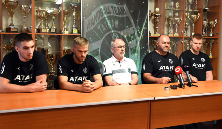 Zľava: Brankár Matúš Mitošinka, stredná spojka Igor Karlov, generálny manažér Marián Magdoško, tréner Ratko Djurkovič a Domagoj Potnar počas tlačovej besedy hádzanárov Tatran Prešov pred začatím prípravy A-tímu mužov na sezónu 2024/2025. Prešov, 8. júl 2024. Foto: SITA/Viktor Zamborský
