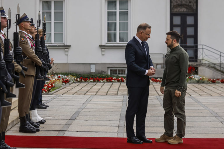 Poľský prezident Andrzej Duda sa v pondelok 8. júla 2024 stretol s ukrajinským prezidentom Volodymyrom Zelenským v paláci Belvedere vo Varšave. Foto: SITA/AP