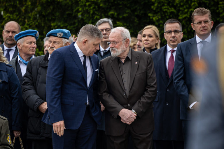 Uprostred zľava: Premiér SR Robert Fico a bývalý prezident SR Ivan Gašparovič na Slavíne pri príležitosti 79. výročia ukončenia 2. svetovej vojny a Dňa víťazstva nad fašizmom. Bratislava, 8. máj 2024. Foto: SITA/Jana Birošová