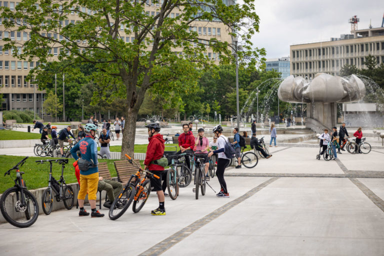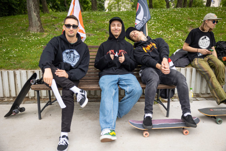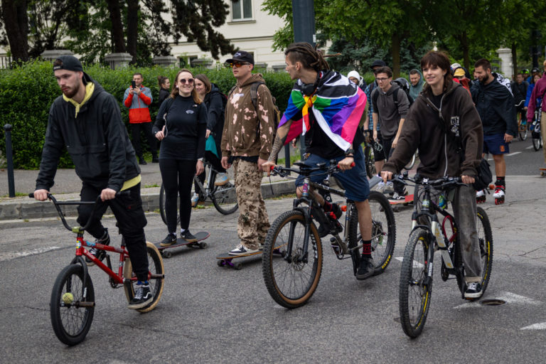 Účastníci počas Antifašistického pojazdu Bratislavou organizovaného Asociáciou downhill skateboardingu v rámci Dňa víťazstva nad fašizmom. Bratislava, 8. máj 2024. Foto: SITA/Jana Birošová
