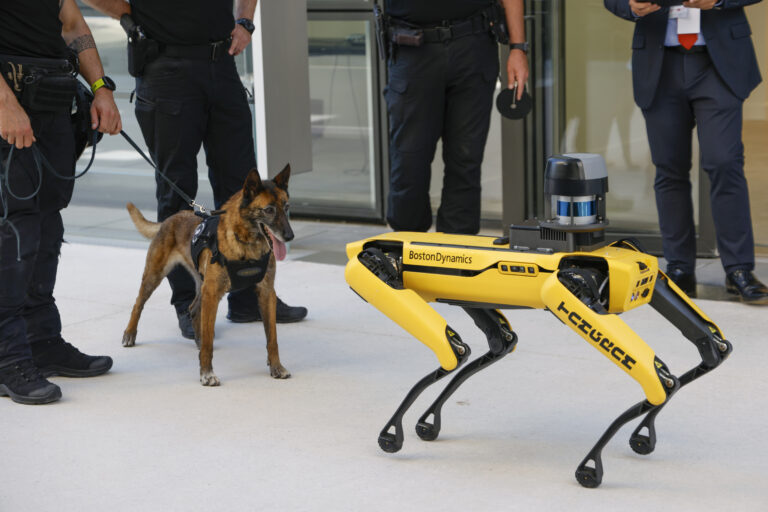 Francúzski policajti a policajný pes kontrolujú psieho robota. Foto: Ludovic Marin, Pool via AP